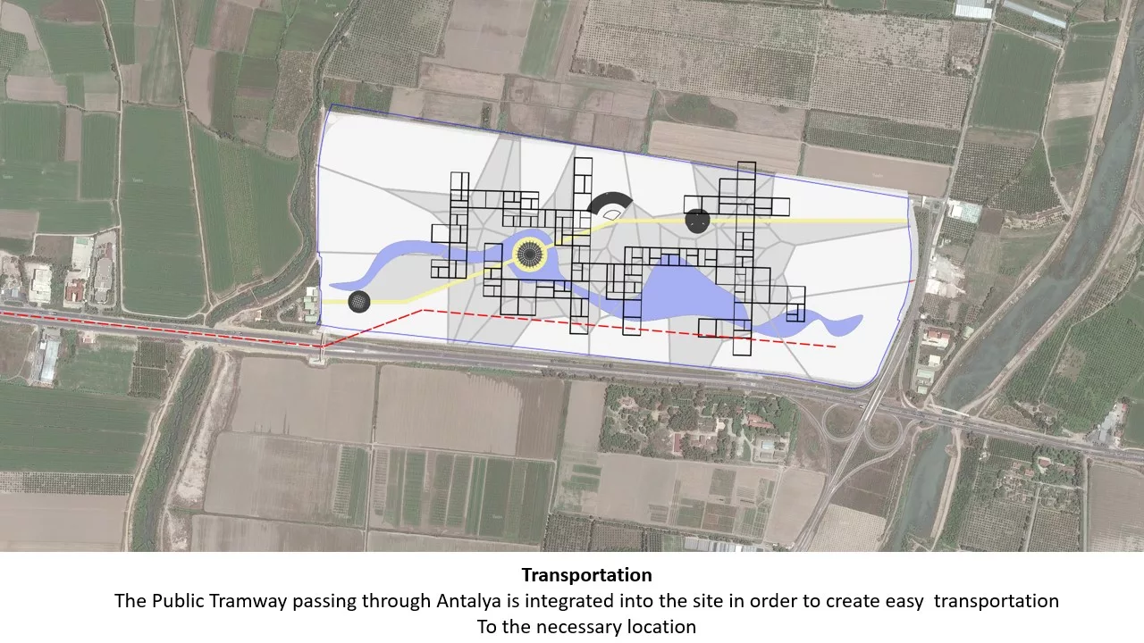 Description: This project takes place in the almost desolated site of the mega-event Expo Antalya 2016 and evaluates it's legacy, proposing a new life for this gigantic lot of around 2sqkm area. The design examines the effects of the current urban factors affecting the growth of the city of Antalya and aims to solve the problem created by the uncontrolled expansion of the city boundaries at the expense of the arable land as well as local agricultural produce, characteristic to the area. The proposal offers an agriculturally and farming friendly approach, becoming a research center and hub for the coexistence of a fast-growing Antalya with its roots in the past related to agriculture. The alienated post-event remains of the Expo merge with the surroundings, becoming a strategic point for the preservation and research of new and existing cultures.