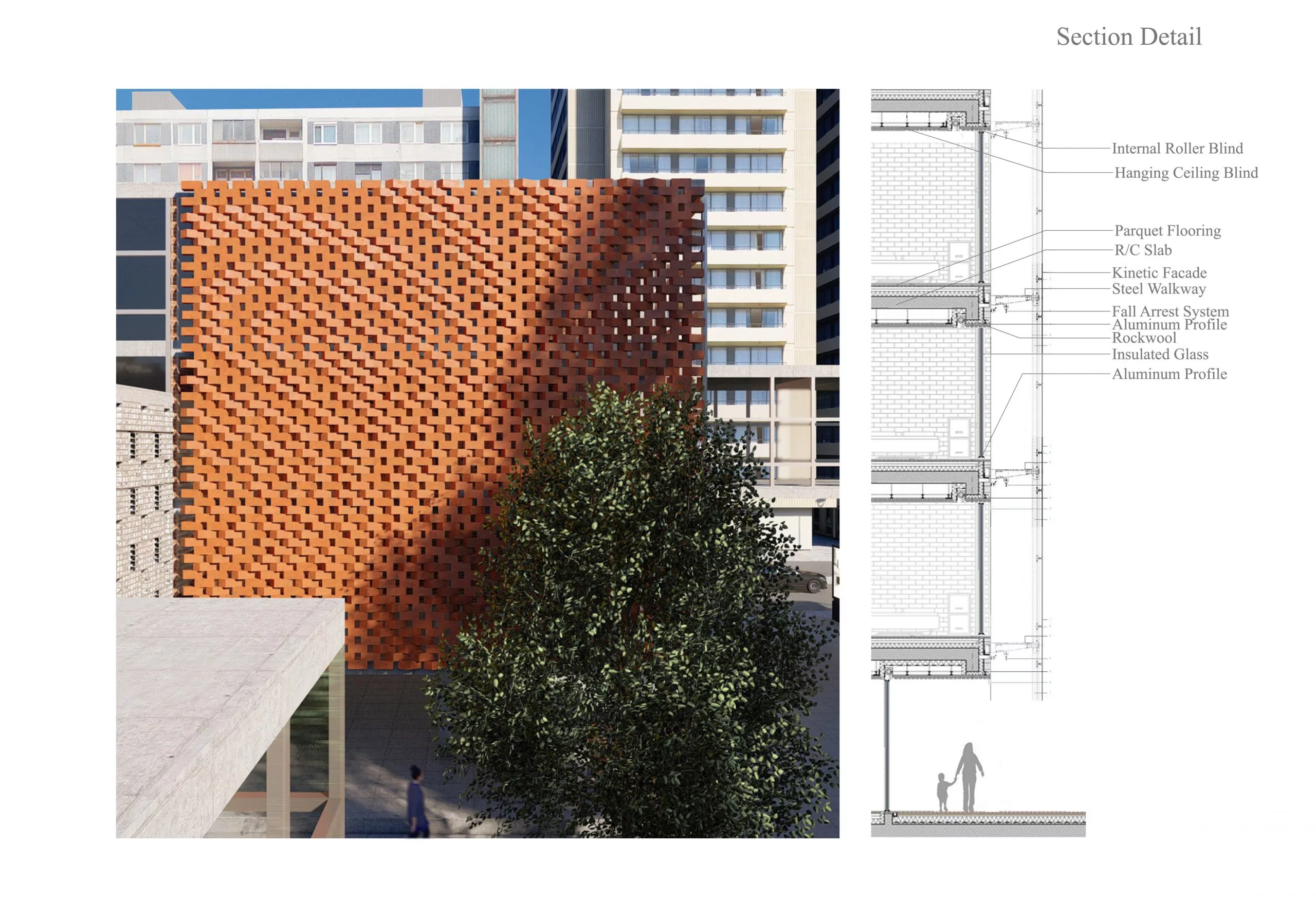 Description: “Return, return whoever you have become, Wanderer, worshipper, lover of leaving- it does not matter, Ours is not a caravan of despair, Return, even if you have broken your vow a hundred times, Come, come again, come,” -Mevlana Celaleddin Rumi- In the words of the famous Rumi, this hostel aims to bring people back to Konya, the old capital of the Seljuk Empire, and later on an important trade point in the Ottoman Turkey. The hostel offers a place for people to rest while visiting the many historical and religious sites of the city, home to poet and scholar Mevlana Rumi, as well as a hub to exhibit and develop artists' works with its open exhibition spaces and studio spaces. The most striking element of the hostel is its media facade which displays images through the rotation of its elements in a pixelated manner.