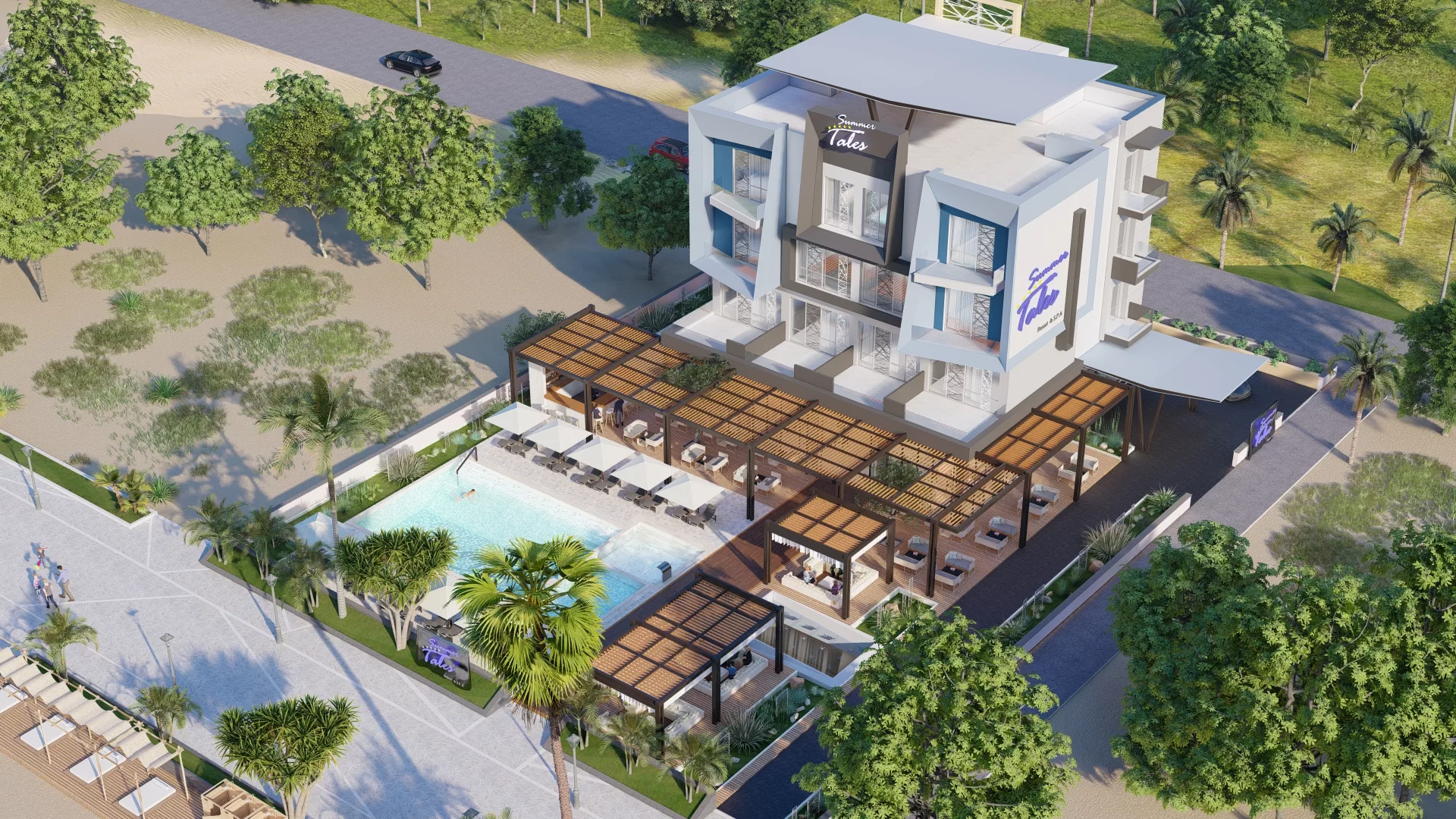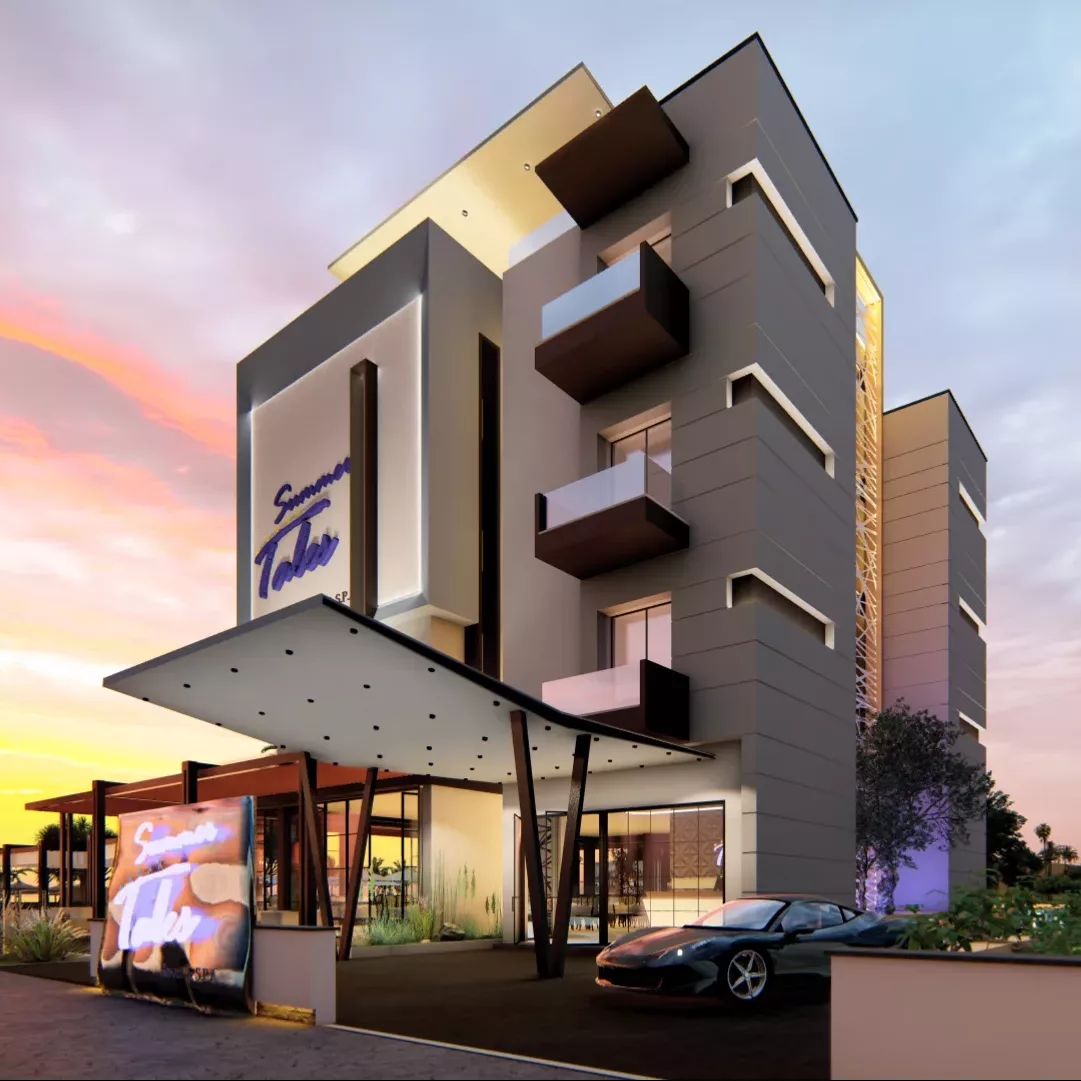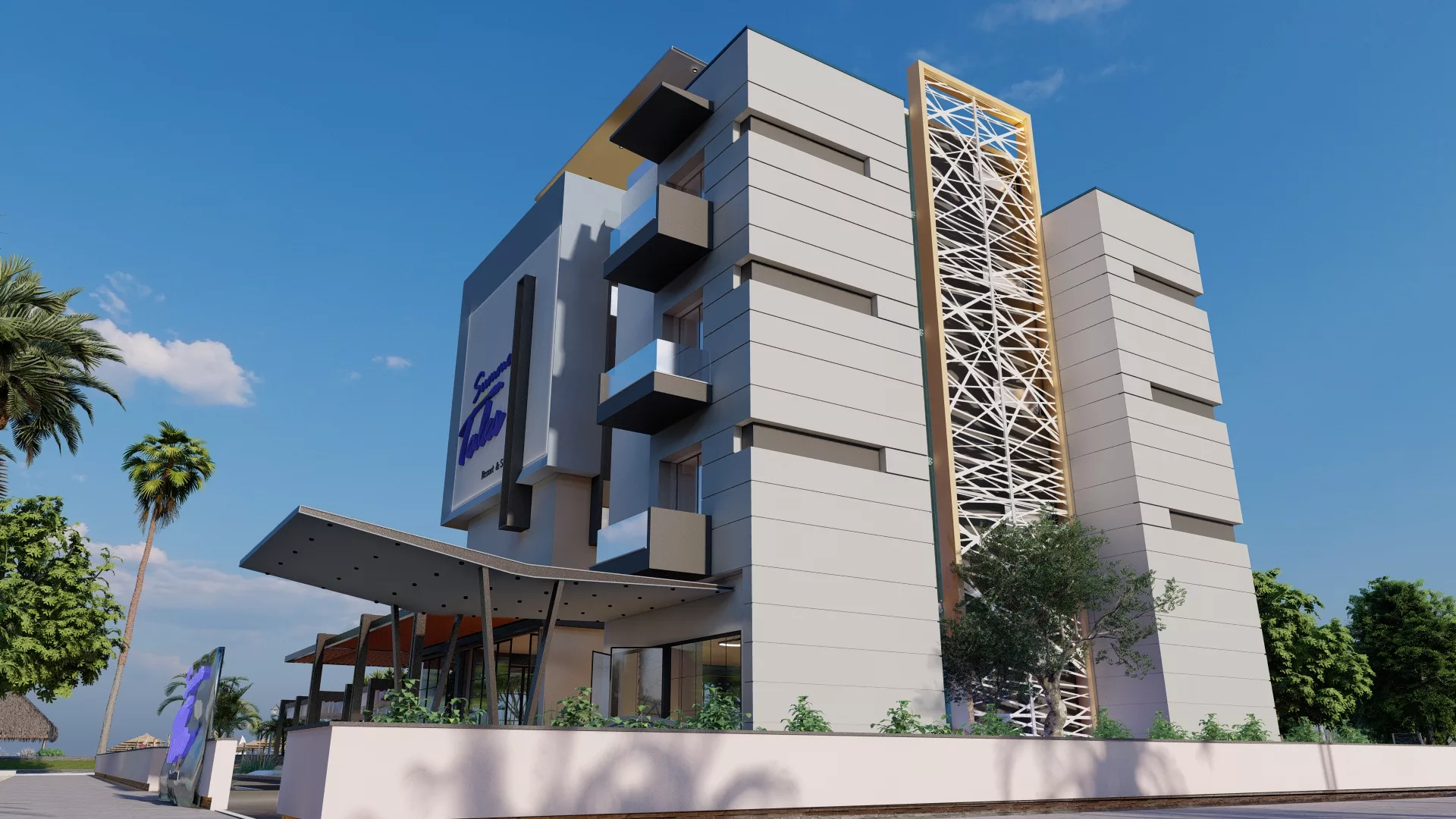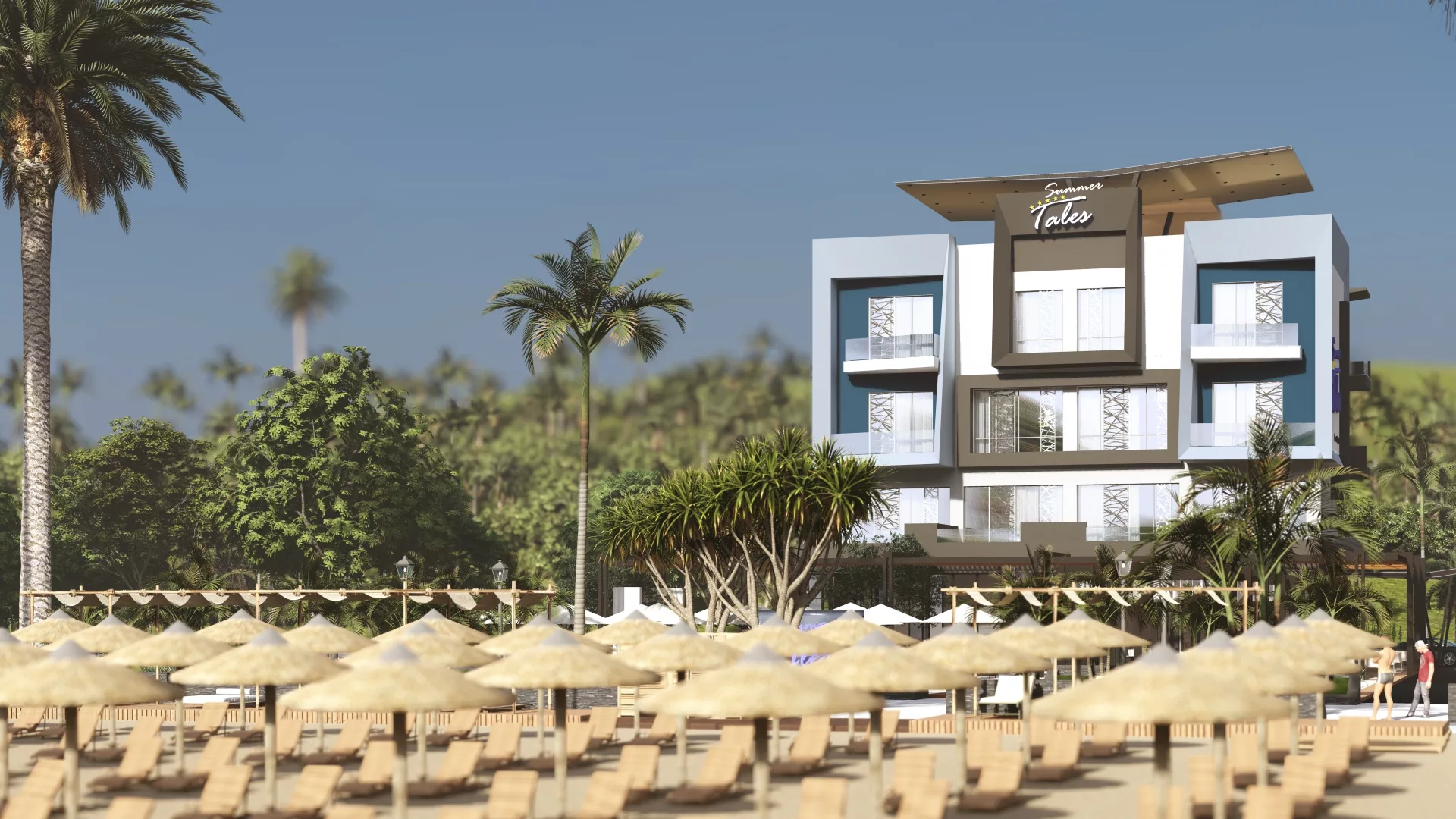 Description: Beachside hotel, on the shores of Adriatic Sea, in the Tale area in Lezha, Albania. The design embraces summer and sea colors and stands out with the playful facade boasting modern shapes.