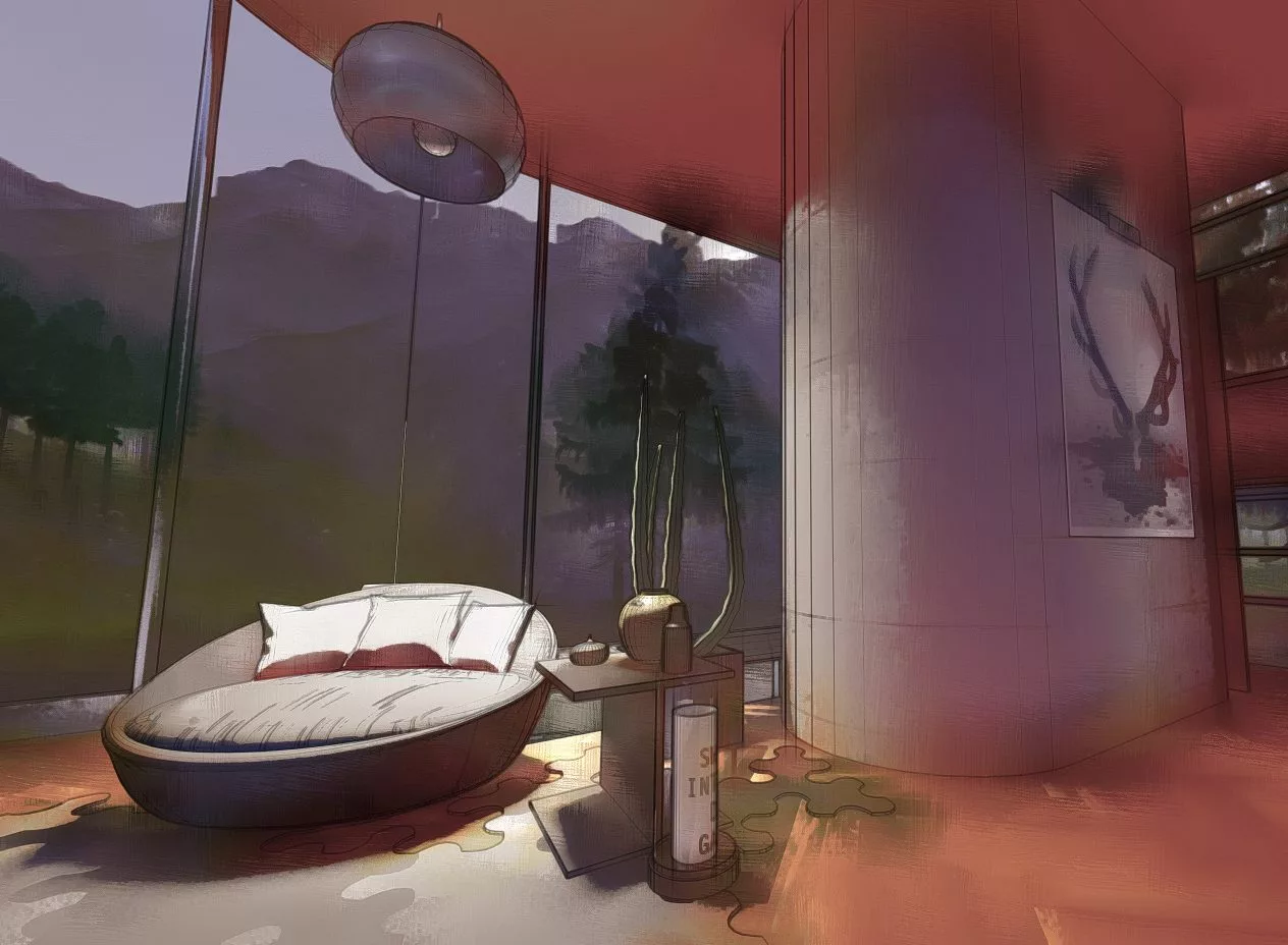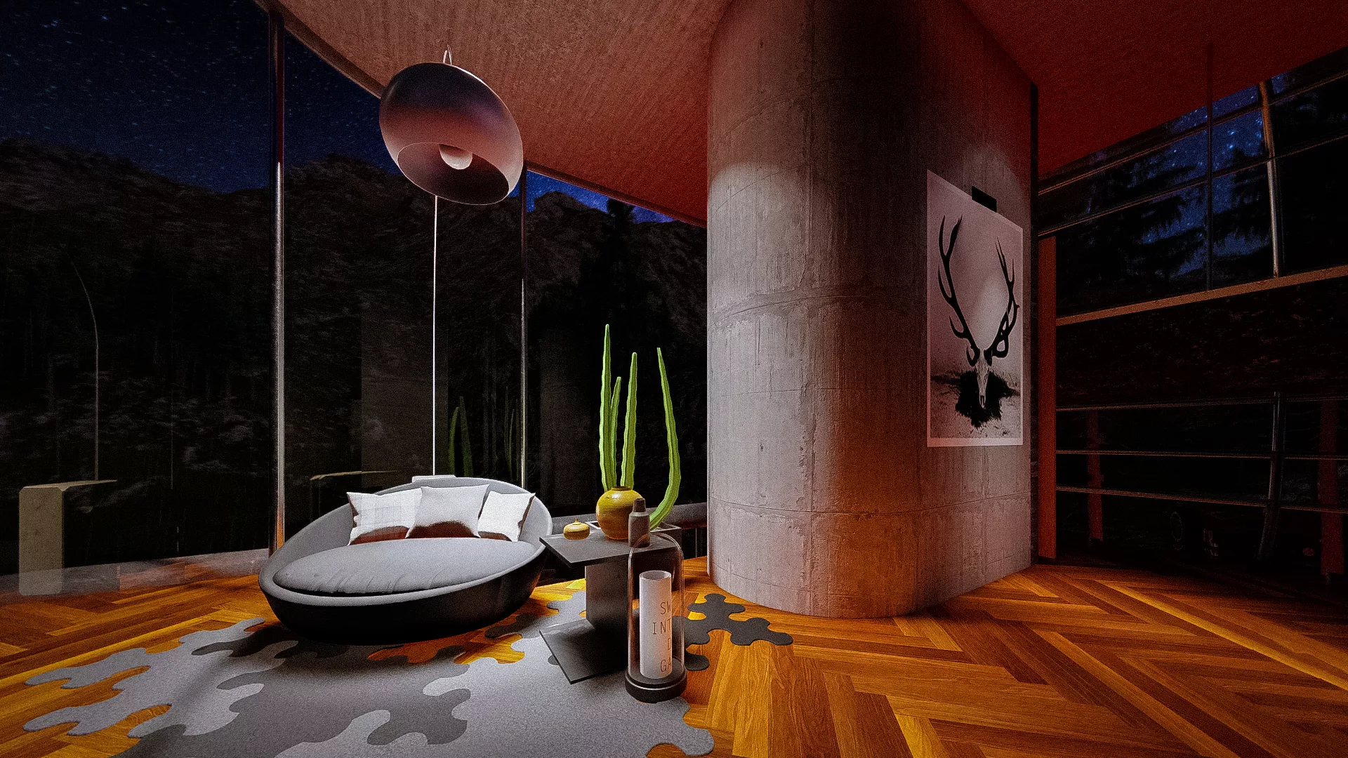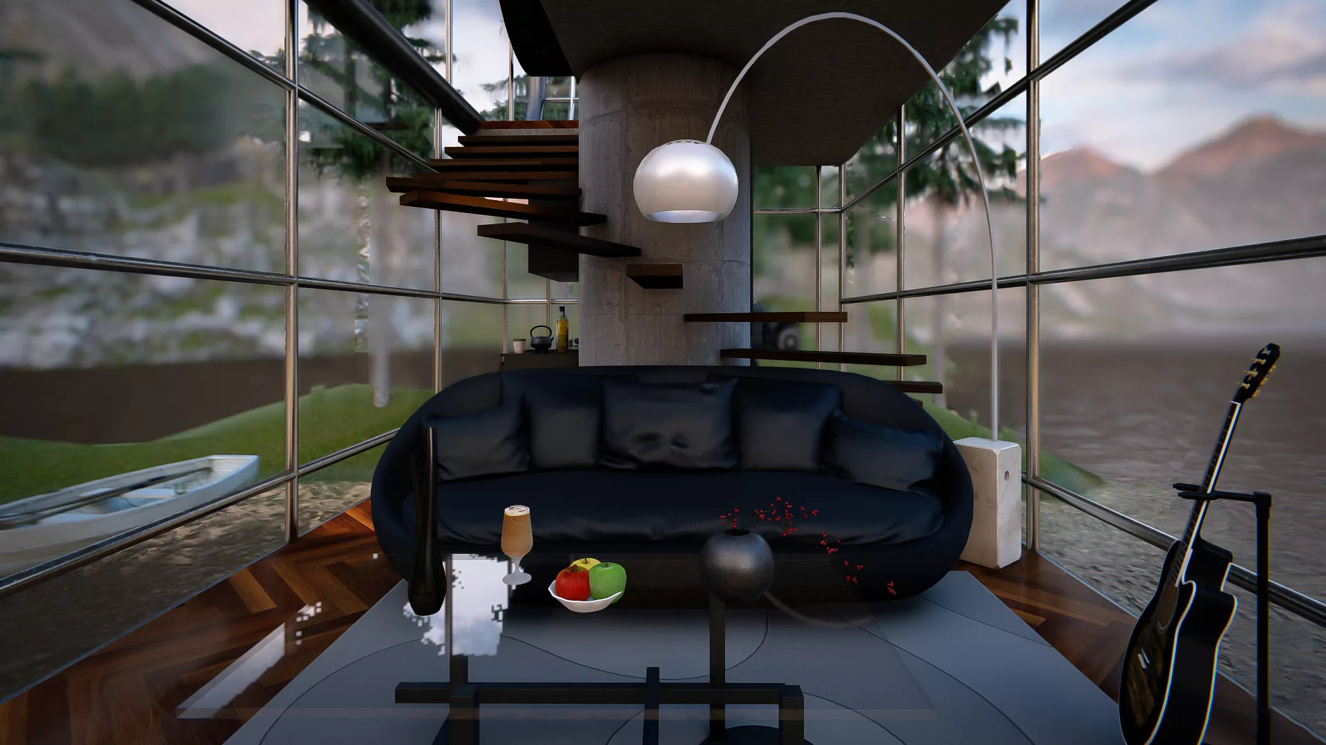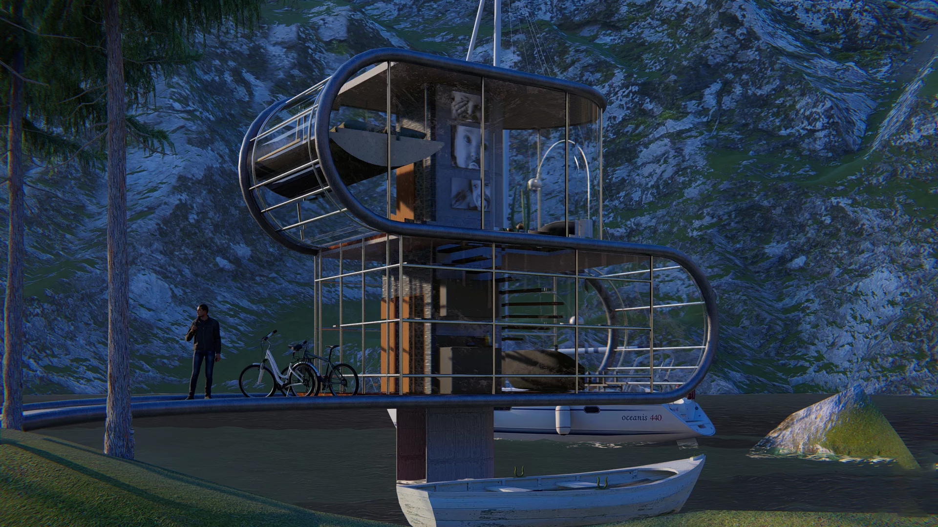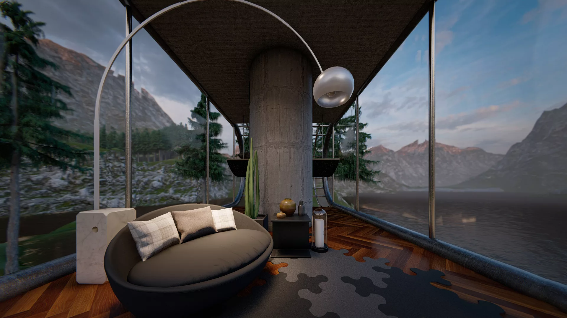 The design is located in an imaginary remote alpine lake, where the occupant can enjoy a meditative experience, away from the stress and noise of their everyday life.